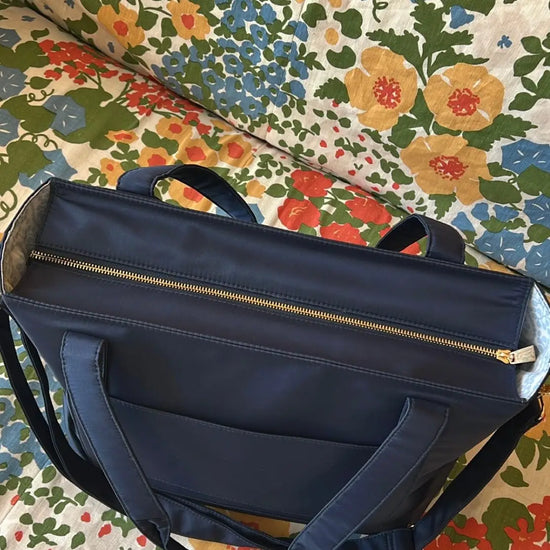 The TRVL x Biscuit travel tote is made with a solid exterior twill and a coated interior liner in our Cecilia print with a thin eco-friendly matte coating. Its roomy interior has a slip pocket for an up to 16” laptop, inner zip pocket, water resistant coating, and an exterior luggage sleeve to keep it snug on top of your carry-on.