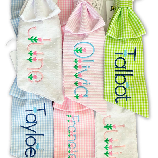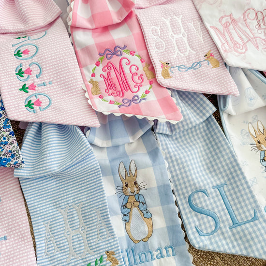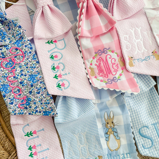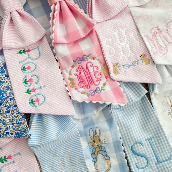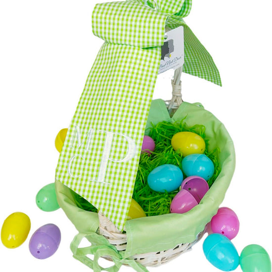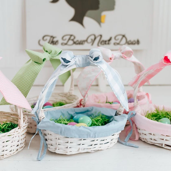 The Bow Next Door has taken their classic bow and turned it into the perfect Basket Bow™! Whether adoring an Easter or gift basket, our monogram-able bow is a showstopper! The bow simply velcros around your existing basket, ready for you to add Easter goodies, holiday presents, or baby shower gifts.