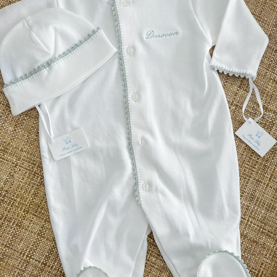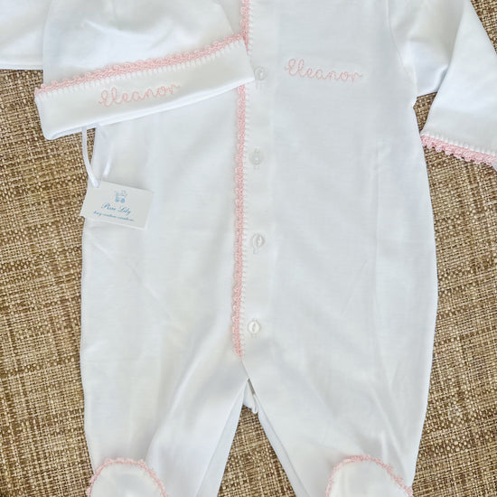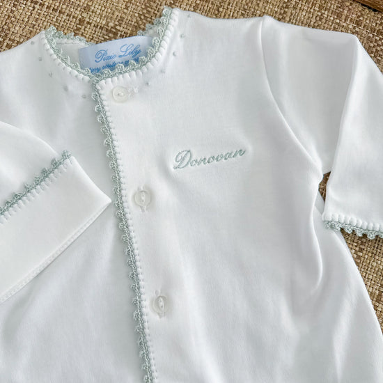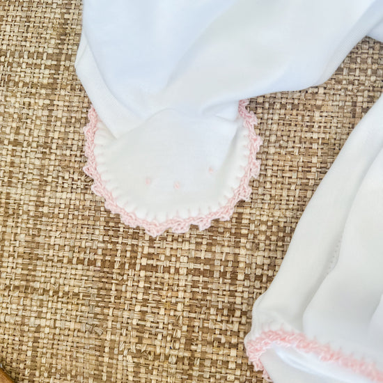 Whether it's January or July, a footy romper is a necessity for baby's wardrobe. Our footy romper buttons down the front and has snaps at the legs for convenient diaper changing. It is trimmed in crochet and has french knots embroidered at the neck.