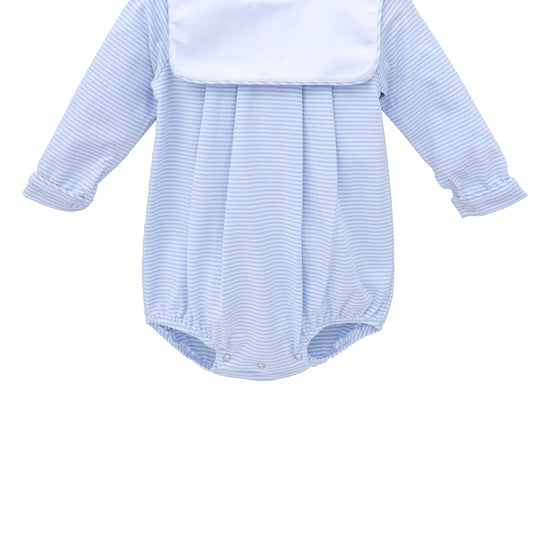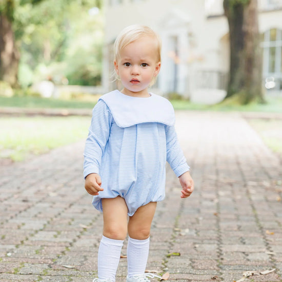Dress your little gentleman in our playful Jack Bubble for fall adventures! This light blue striped bubble features a charming square collar and cozy long sleeves that keep him warm while looking adorably dapper. Perfect for family photos, special occasions, or just showing off his budding style around the playground! For a personalized touch, the bubble can be monogrammed, or it can be worn as is for a classic look.