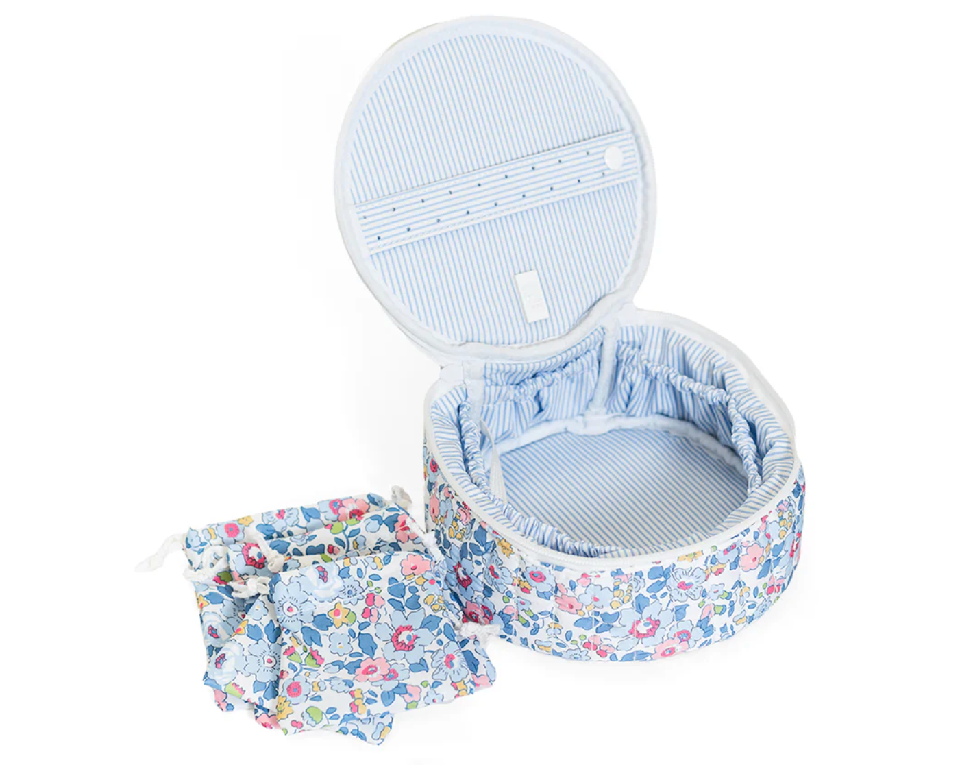 Our Quilted Jewel Round is super lightweight and a perfect place to store your bits and baubles. It opens up to offer ample room for earrings, necklaces, rings, and bracelets with elasticized compartments around the outer edge. This also comes with a snappable earing bar and 4 drawstring pouches that can be gathered together on a keeper. This case makes the perfect thoughtful gift for a lover of jewelry and accessories, or an ideal treat for yourself when you're off on your travels.