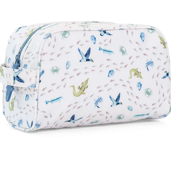 This soft yet sturdy toiletry bag is the perfect Stowaway at home or on the go! It's roomy size can store your grooming supplies, make-up, hair care, plus holds a supply of diapers and wipes. Styled with a chunky top zip, wide gusset and side handle plus a roomy interior and wall pocket - the exterior is coated and interior is wipeable and this bag is machine washable!